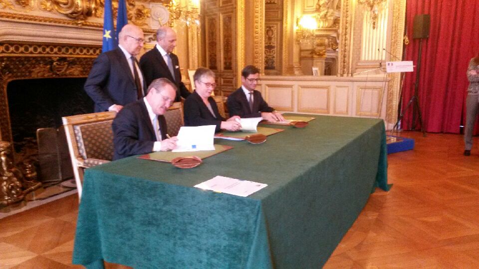 Les dirigeants des deux groupes financiers publics, Anne Paugam, pour l’AFD, Claude Périou pour Proparco (filiale de l’AFD dédiée au financement du secteur privé), Nicolas Dufourcq pour Bpifrance ont signé solennellement aujourd’hui 19 décembre, au Quai d’Orsay, un accord-cadre de partenariat sur deux ans, en présence de leurs ministres de tutelle Laurent Fabius, ministre des Affaires étrangères et du développement international et de Michel Sapin, ministre des Finances et des comptes publics, accord cadre qui amplifie leur collaboration dans différents domaine (notre photo).