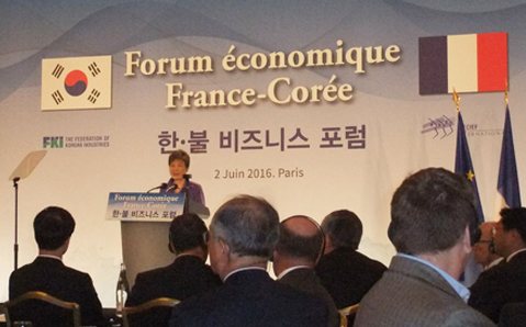 Organisé à l’occasion du 130e anniversaire des relations diplomatiques bilatérales et de la visite officielle dans l’Hexagone de la présidente Park Geun-hye (sur notre photo, lors du forum), cet évènement s’inscrit dans toute une série de rendez-vous, comme en 2015 le déplacement de François Hollande à Séoul, le 4 novembre, et le Forum franco-coréen d’innovation industrielle, le 26 du même mois à Bercy. A l’occasion de cette dernière manifestation, le ministre de l’Économie, de l’industrie et du numérique, Emmanuel Macron, s’était félicité des trois secteurs de coopération bilatérale déjà ciblés : e-santé, nanotechnologies et véhicule du futur.